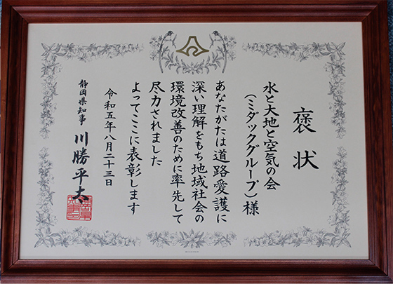 ミダックグループでは、2004年度より事業所周辺の道路清掃や除草活動の実施、併せて道路の危険箇所のチェック等も行っています。これらの活動が、地域の道路環境の向上に貢献しているとして、静岡県知事より褒状が贈られました。